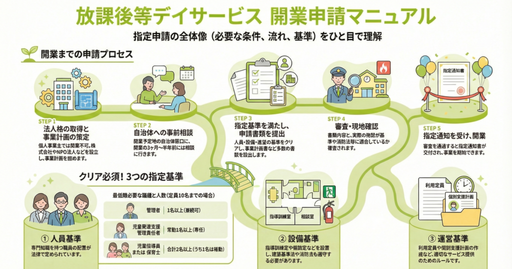 開業の核心は「基準」のクリアです。オーナー自身に資格は不要ですが、代わりに国が定める厳格なルール、すなわち「指定基準」を満たすことが絶対条件です。これは「人(人員)」「モノ(設備)」「ルール(運営)」の3つの側面から構成されており、全てを満たす必要があります。
