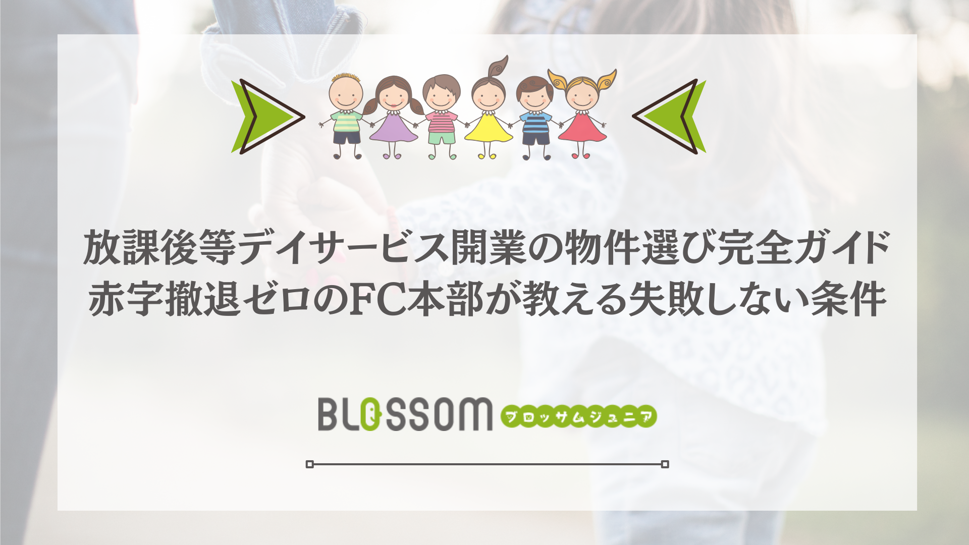 放課後等デイサービスの開業において、物件選びは事業の命運を握る最重要プロセスです。立地や設備が指定基準を満たさなければ、どんなに良い療育理念があっても開業すらできません。本記事では、赤字撤退ゼロを誇るブロッサムグループが、法令遵守と集客を両立させる物件選びの極意と、失敗しないための具体的なチェックポイントを徹底解説します。
