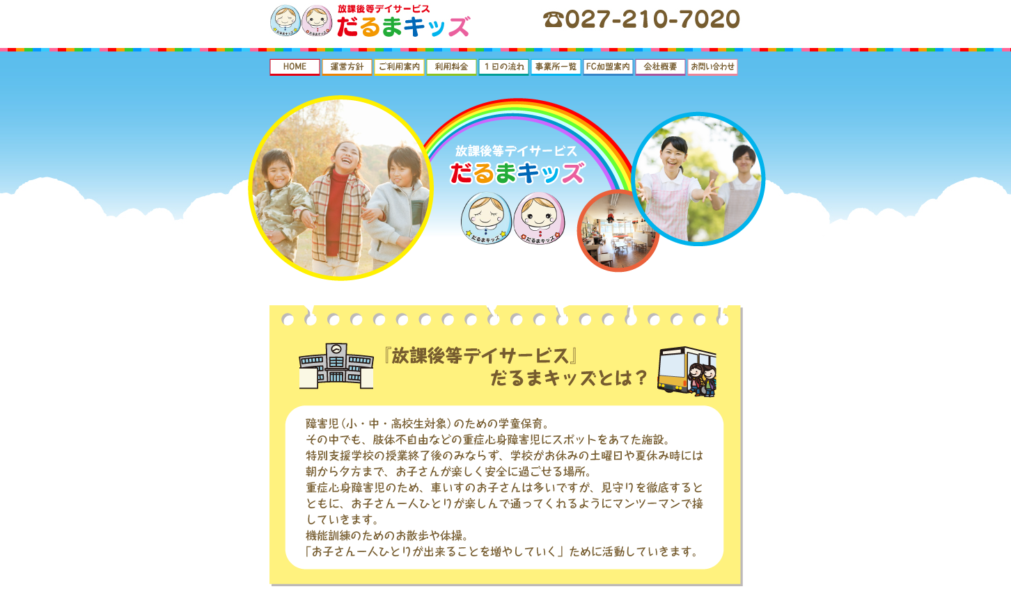 だるまキッズは、重症心身障害児を対象に、家庭と学校以外の「もうひとつの家族」としての役割を果たすことを理念としています。子どもの感情を大切にし、興味のある活動を通じて積極性を伸ばす取り組みが特徴です。