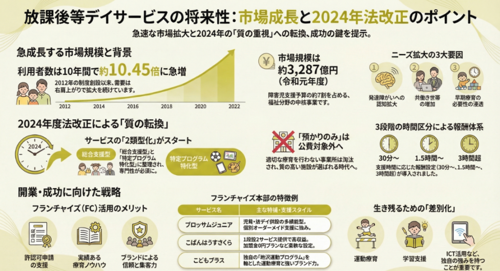 放課後等デイサービスは、事業所数2.2万カ所超・利用者数37.5万人・総費用額4,669億円と、数字が示す通り拡大を続ける成長市場です。発達障害への理解浸透、共働き世帯の増加、国の制度による安定した収益構造──追い風はまだまだ続いています。