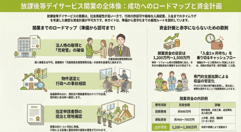 開業は、思い立ってすぐにできるものではありません。法人設立から始まり、物件の選定、人材採用、そして行政への「指定申請」という複雑なプロセスを経る必要があります。開業を決意してから、実際に開設するまでには半年から1年近くかかることも。全体の流れを把握することが重要です。