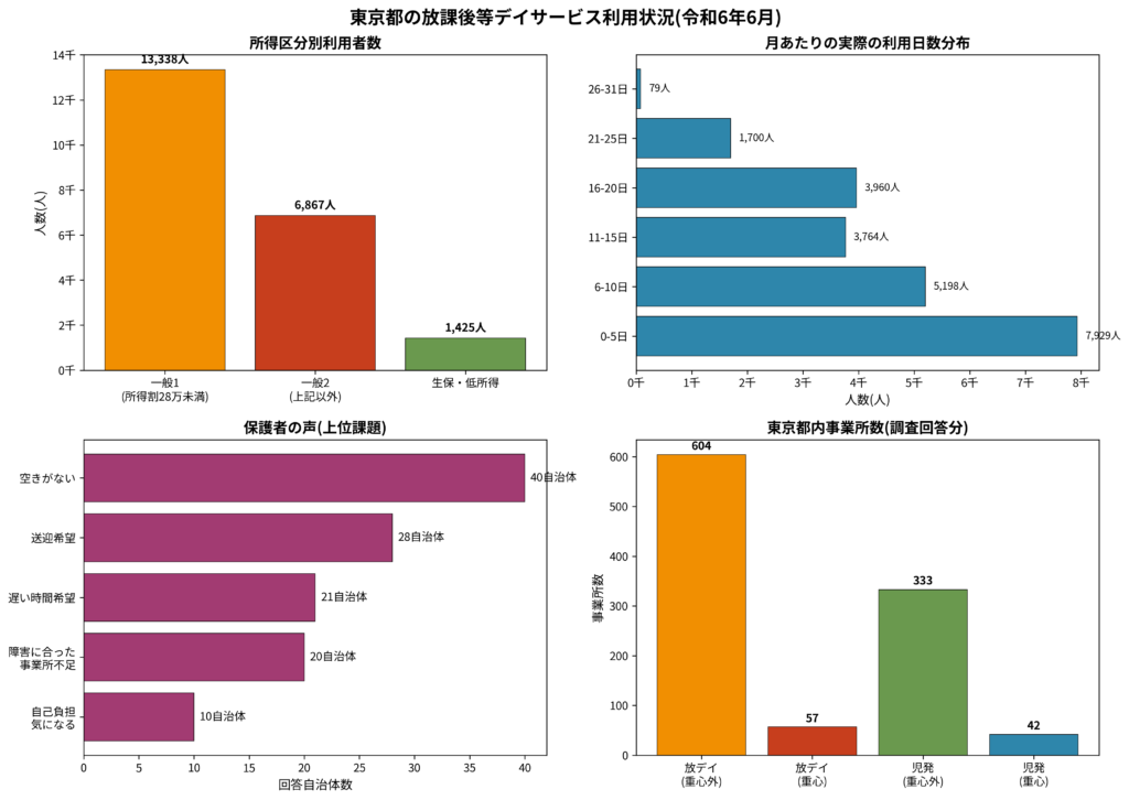 • 保護者ニーズ: 「事業所の空き不足」が最大の課題(40自治体/65%)