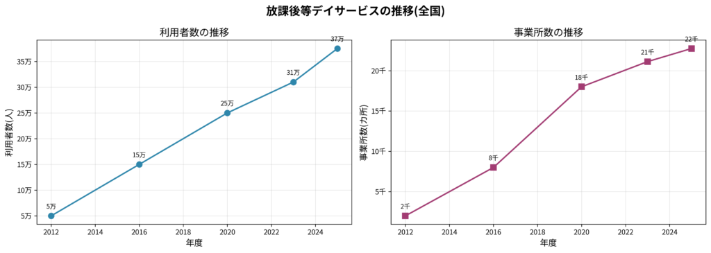 東京23区における放課後等デイサービスは、発達障害の認知度向上共働き世帯の増加を背景に、需要が継続的に増加しています。令和7年(2025年)1-3月時点で全国の利用者数は約37.5万人、事業所数は2.2万カ所に達しています。